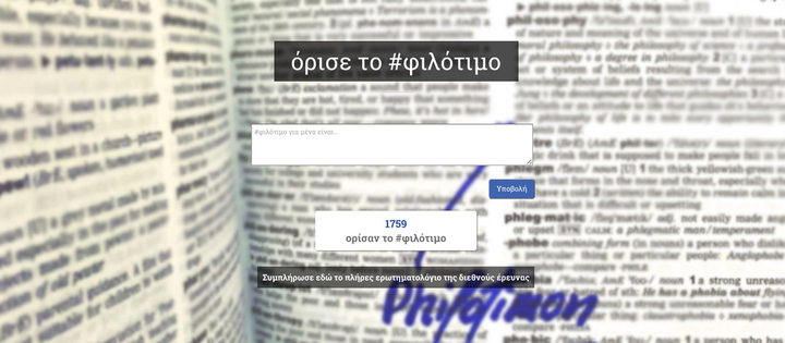 Στην ιστοσελίδα philotimo.org είναι αναρτημένη η έρευνα την οποία ο καθένας μπορεί να συμπληρώσει δίνοντας το δικό του ορισμό για την ερμηνεία και την ιστορία του φιλότιμου. Μια λέξη και μια έννοια μοναδικά ελληνική για την οποία η διεθνής καμπάνια...τρέχει!