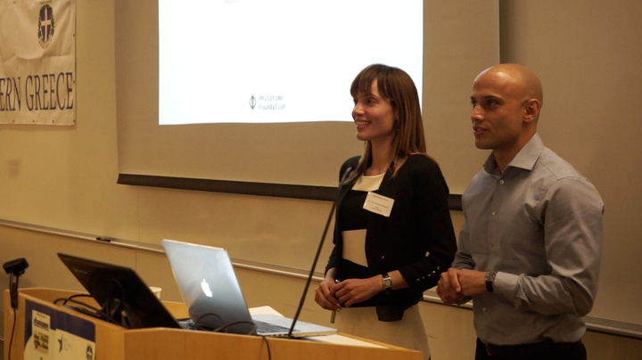 Ο Μάνος Χατζημαλωνάς μαζί με την συνεργάτιδά του Δόκτωρ Ελίνα Θεοδωρακοπούλου την ώρα που ανακοινώνουν τα πρώτα αποτελέσματα της έρευνας στο Harvard