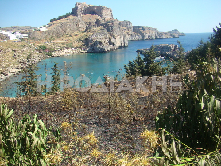 Στάχτες και αποκαΐδια, λίγο έλειψε να γίνει προχθές το βράδυ ένα από τα ομορφότερα τοπία της Ρόδου και μια από τις ιστορικότερες εκκλησίες του νησιού, ο Άγιος Παύλος της Λίνδου, εκεί όπου κήρυξε τον Χριστιανισμό πριν από χιλιάδες χρόνια ο Απόστολος των Εθνών.
