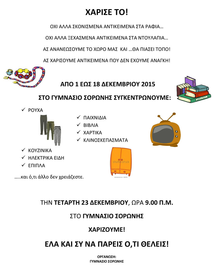 Ο Σύλλογος Διδασκόντων και η Διευθύντρια του Γυμνασίου Σορωνής οργανώνουν για τέταρτη χρονιά χαριστικό παζάρι, με τη βοήθεια των μαθητών και μαθητριών του σχολείου, καθώς και των γονέων και κηδεμόνων τους.