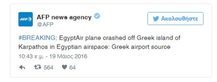 «Η πτήση νο. MS804 που εκτελούσε δρομολόγιο από το Παρίσι με προορισμό το Κάιρο χάθηκε από τα ραντάρ», ανακοίνωσε η εταιρεία μέσω Twitter.