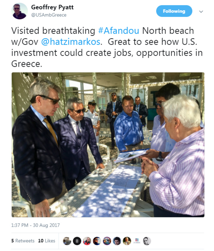 Έγραψε συγκεκριμένα ο Αμερικανός πρέσβης: «Επισκέφθηκα τη βόρεια παραλία των Αφάντου, που κόβει την ανάσα, μαζί με τον Περιφερειάρχη κ. Χατζημάρκο.