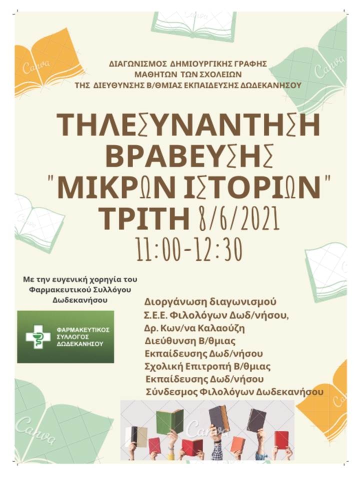Την Τρίτη 8 Ιουνίου 2021 στις 11:00-12:30 μέσω τηλεσυνάντησης θα πραγματοποιηθεί εκδήλωση προς τιμήν όλων των μαθητών που συμμετείχαν στον διαγωνισμό δημιουργικής γραφής «Δημιουργώντας μικρές ιστορίες» που διοργάνωσε η Σ.Ε.Ε. Φιλολόγων Δωδεκανήσου δρ. Κωνσταντίνα Καλαούζη του 2ου ΠΕΚΕΣ Νοτίου Αιγαίου σε συνεργασία με τη Διεύθυνση Β/θμιας Εκπαίδευσης Δωδεκανήσου και τον Σύνδεσμο Φιλολόγων Δωδεκανήσου με την ευγενική χορηγία της Σχολικής Επιτροπής Δευτεροβάθμιας Εκπαίδευσης Ρόδου και του Φαρμακευτικού Συλλόγου Δωδεκανήσου.