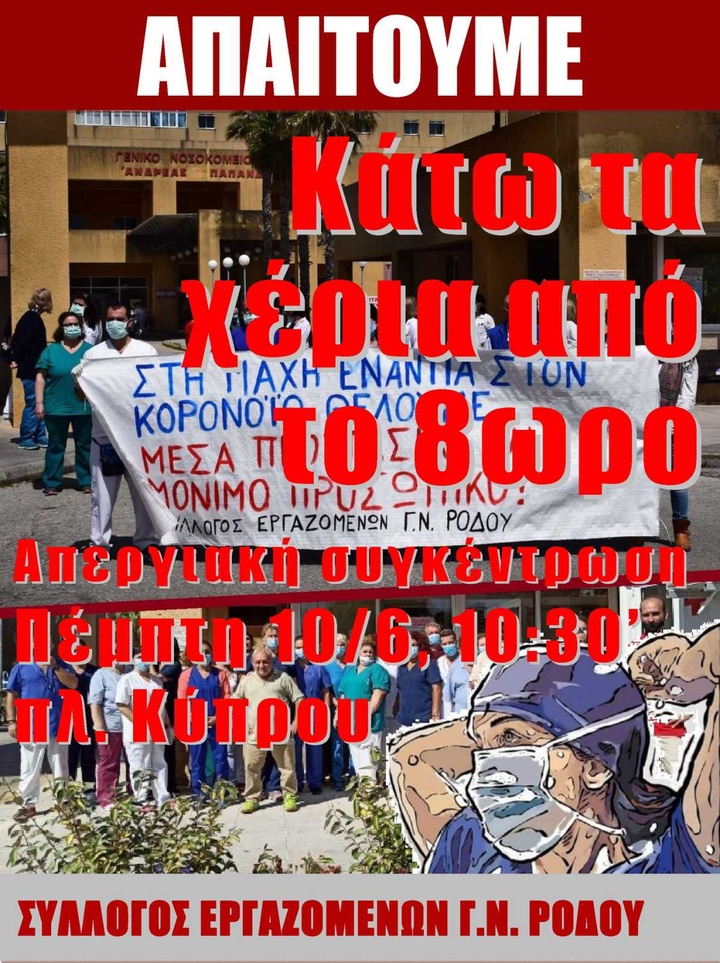 Οι εργαζόμενοι στο Γενικό Νοσοκομείο Ρόδου και τις υπόλοιπες δημόσιες μονάδες υγείας συνεχίζουμε την προσπάθεια ενάντια στην επιδημία COVID-19 αλλά και συνολικά για την προστασία της υγείας των λαϊκών οικογενειών.