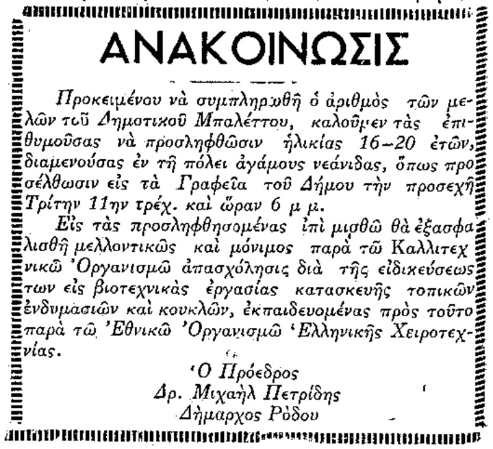 Δι’ αποφάσεως του Πρωτοδικείου ενεκρίθη η ίδρυσις Συλλόγου υπό την επωνυμίαν «Εθνικός Σύνδεσμος Εθελοντών Εφέδρων Δωδεκανησίων Πολεμιστών» με έδραν την Ρόδον. Κατόπιν τούτου, εκλήφθησαν οι ενδιαφερόμενοι όπως παρουσιασθούν εις το γραφείον του δικηγόρου κ. Κ. Φραράκη, προς εγγραφήν.