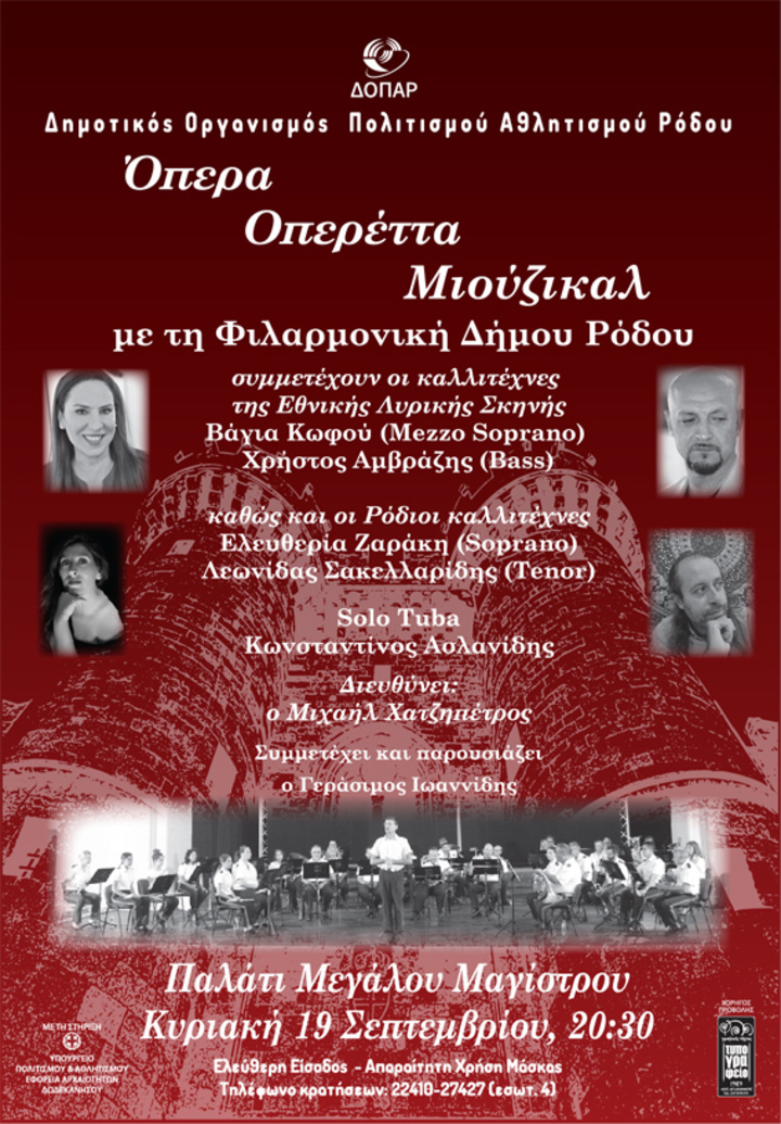 Αφιέρωμα στην Όπερα, την Οπερέττα και το Μιούζικαλ με τη συμμετοχή των τραγουδιστών της Λυρικής Σκηνής Βάγιας Κωφού (mezzo soprano) και του Χρήστου Αμβράζη (Baritone) καθώς και των Ρόδιων καλλιτεχνών Ελευθερίας Ζαράκη (Soprano) και Λεωνίδα Σακελλαρίδη (Tenor).