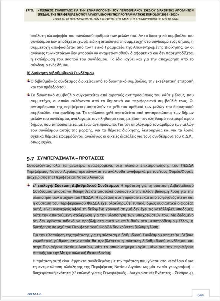 Η σύσταση διαβαθμιδικού ΦΟΔΣΑ στο Νότιο Αιγαίο κρίθηκε από την Γενική Γραμματεία Διαχείρισης Στερεών Αποβλήτων της κυβέρνησης Τσίπρα ως η βέλτιστη λύση για να υλοποιηθούν τα προβλεπόμενα στο ΠΕΣΔΑ Νοτίου Αιγαίου, έργα και δράσεις διαχείρισης των απορριμμάτων στα νησιά. Το ΠΕΣΔΑ Νοτίου Αιγαίου έγινε νόμος του κράτους από την κυβέρνηση ΣΥΡΙΖΑ στις 27/12/2016 με Κοινή Υπουργική Απόφαση του Υπουργού Εσωτερικών Πάνου Σκουρλέτη και του Αναπληρωτή Υπουργού Περιβάλλοντος, Σωκράτη Φάμελλου και δημοσιεύθηκε στο ΦΕΚ 4317 της 30/12/2016.