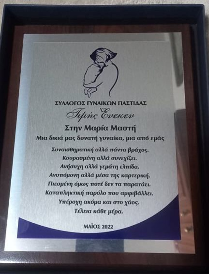 Τιμητική διάκριση για τον τιτάνιο αγώνα που δίνουν όλες οι μανούλες που έχουν παιδιά με αυτισμό απένειμε την προηγούμενη Κυριακή ο σύλλογος Γυναικών Παστίδας, στο πρόσωπο της Μαρίας Μαστή, για την προσπάθεια και το κουράγιο της ως μητέρας με αυτιστικό παιδί.