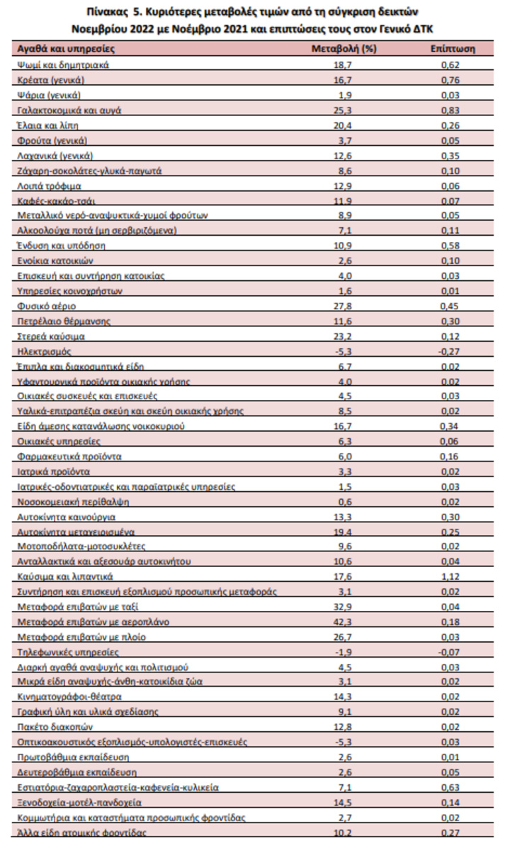 Η αύξηση του Γενικού ΔΤΚ κατά 8,5% τον μήνα Νοέμβριο 2022, σε σύγκριση με τον αντίστοιχο Δείκτη του Νοεμβρίου 2021, προήλθε κυρίως από τις μεταβολές στις ακόλουθες ομάδες αγαθών και υπηρεσιών: