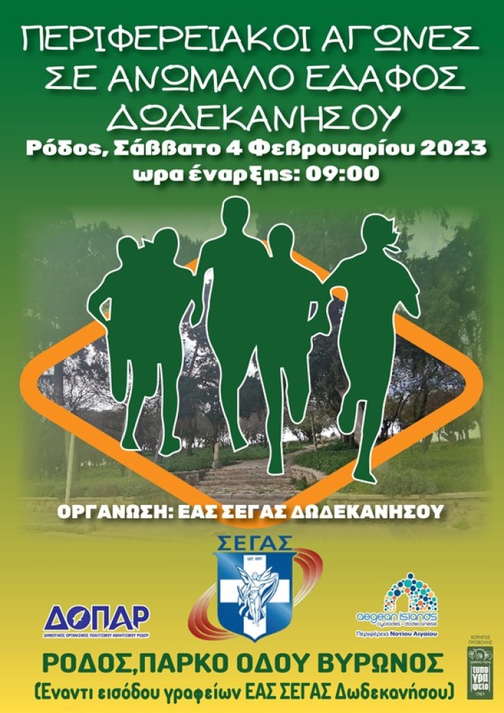 Από την ΕΑΣ ΣΕΓΑΣ Δωδεκανήσου θα διεξαχθεί αύριο στο Πάρκο Βύρωνος ο περιφερειακός αγώνας σε ανώμαλο έδαφος για το 2023 που αφορά τα σωματεία που ανήκουν στη δύναμή της. Η εκκίνηση θα δοθεί για το πρώτο αγώνισμα στις 9.00 και το πρόγραμμα αναμένεται να ολοκληρωθεί στις 12.30, αν και το ακριβές θα γίνει γνωστό σήμερα.
