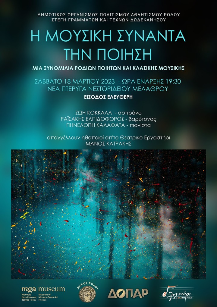 Το Σάββατο 18 Μαρτίου και ώρα 19:30 στη νέα πτέρυγα του Νεστοριδείου Μελάθρου θα πραγματοποιηθεί εκδήλωση με ποιήματα σύγχρονων Ρόδιων ποιητών, κλασικά τραγούδια και έργα πιανιστικού ρεπερτορίου με τίτλο: «Η μουσική συναντά την ποίηση».