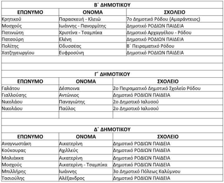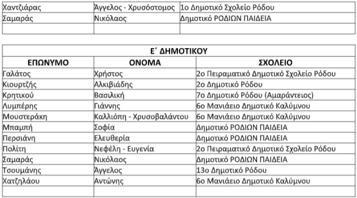 Τα ονόματα των μαθητών ανά τάξη και κατ’ αλφαβητική σειρά, καθώς και το σχολείο φοίτησής τους παρουσιάζονται στον πίνακα που ακολουθεί: