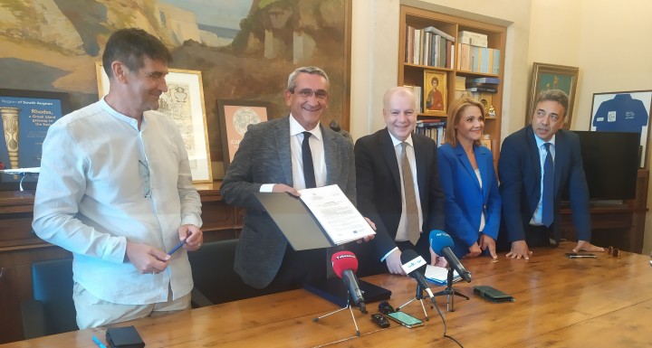 Την εργολαβική σύμβαση, ύψους 17.191.422,74 ευρώ υπέγραψαν ο περιφερειάρχης Νοτίου Αιγαίου, Γιώργος Χατζημάρκος, ο δήμαρχος Ρόδου, Αντώνης Καμπουράκης και ο εκπρόσωπος της αναδόχου εταιρείας “P. &C. DEVELOPMENTS.A.”, Κωνσταντίνος Παναγιωτόπουλος, ενώ παραβρέθηκαν η υποψήφια βουλευτής Δωδεκανήσου, Μίκα Ιατρίδη, και ο αντιδήμαρχος Πολιτιστικών Μνημείων και Υπηρεσίας Δόμησης, Στέφανος Δράκος.