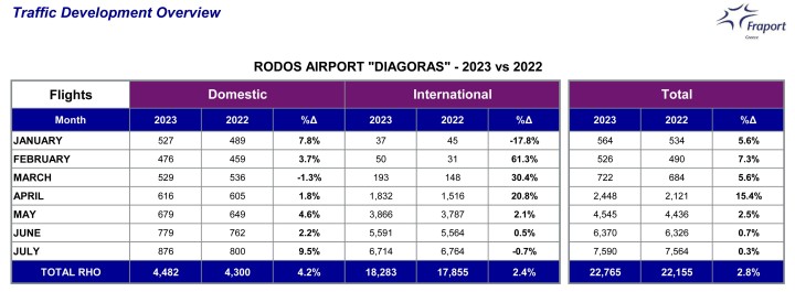 Σε ό,τι αφορά τις πτήσεις, η μείωση του περασμένου μήνα κυμάνθηκε μόλις στο 0,7% για τις πτήσεις τσάρτερ καθώς εξυπηρετήθηκαν 6.714 έναντι 6.764 τον ίδιο μήνα πέρυσι. Συγκεντρωτικά, μαζί με τις πτήσεις εσωτερικού εξυπηρετήθηκαν από το αεροδρόμιό μας 7.590 πτήσεις έναντι 7.564 τον Ιούλιο του 2022.