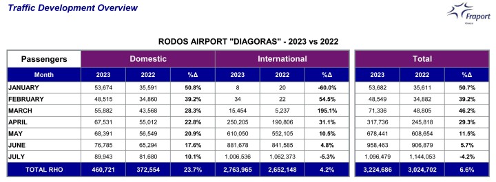 Κοντά στο 13% έφτασε η μείωση της τουριστικής κίνησης στη Ρόδο τον Ιούλιο σύμφωνα με τα επίσημα στοιχεία που ανακοίνωσε η Fraport Greece, ως απόρροια του κύματος των ακυρώσεων που σημειώθηκε στο νησί μας κατά τη διάρκεια της μεγάλης πυρκαγιάς του προηγούμενου μήνα.