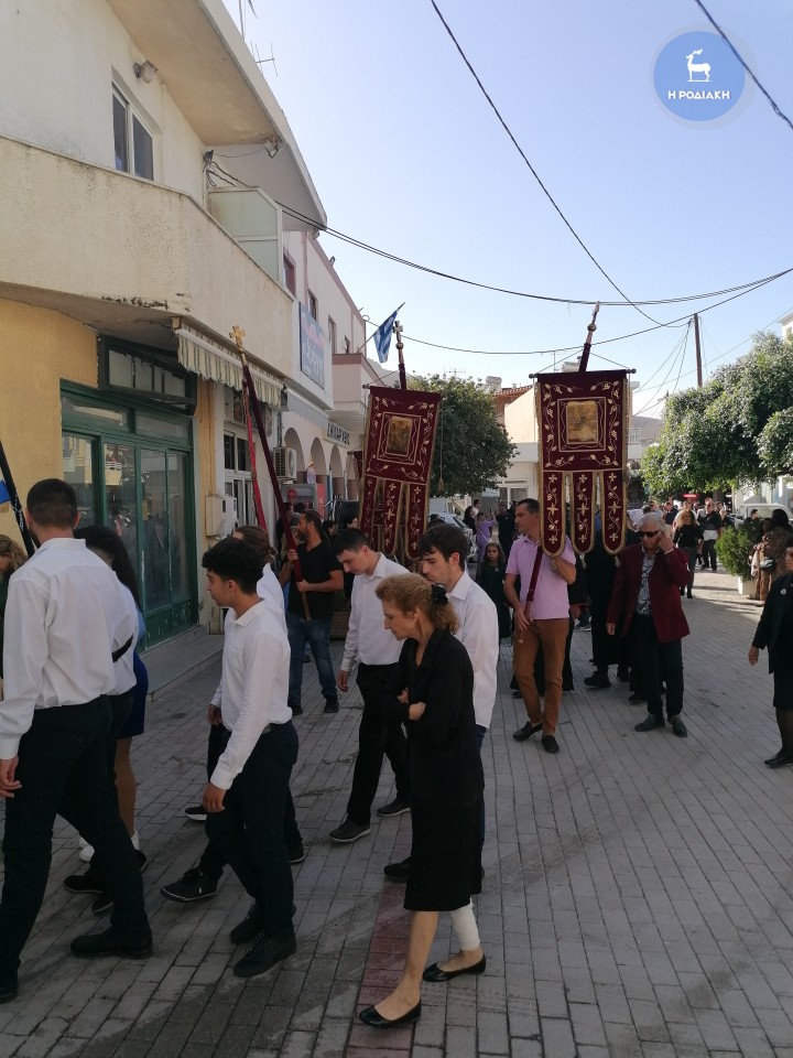 Του Όρθρου χοροστάτησε ο σεβασμιότατος Μητροπολίτης Ρόδου κ.κ. Κύριλλος, ενώ ακολούθησε λιτανεία της ιερής εικόνας με τη συνοδεία της Φιλαρμονικής Αρχαγγέλου, μαθητών και πιστών.