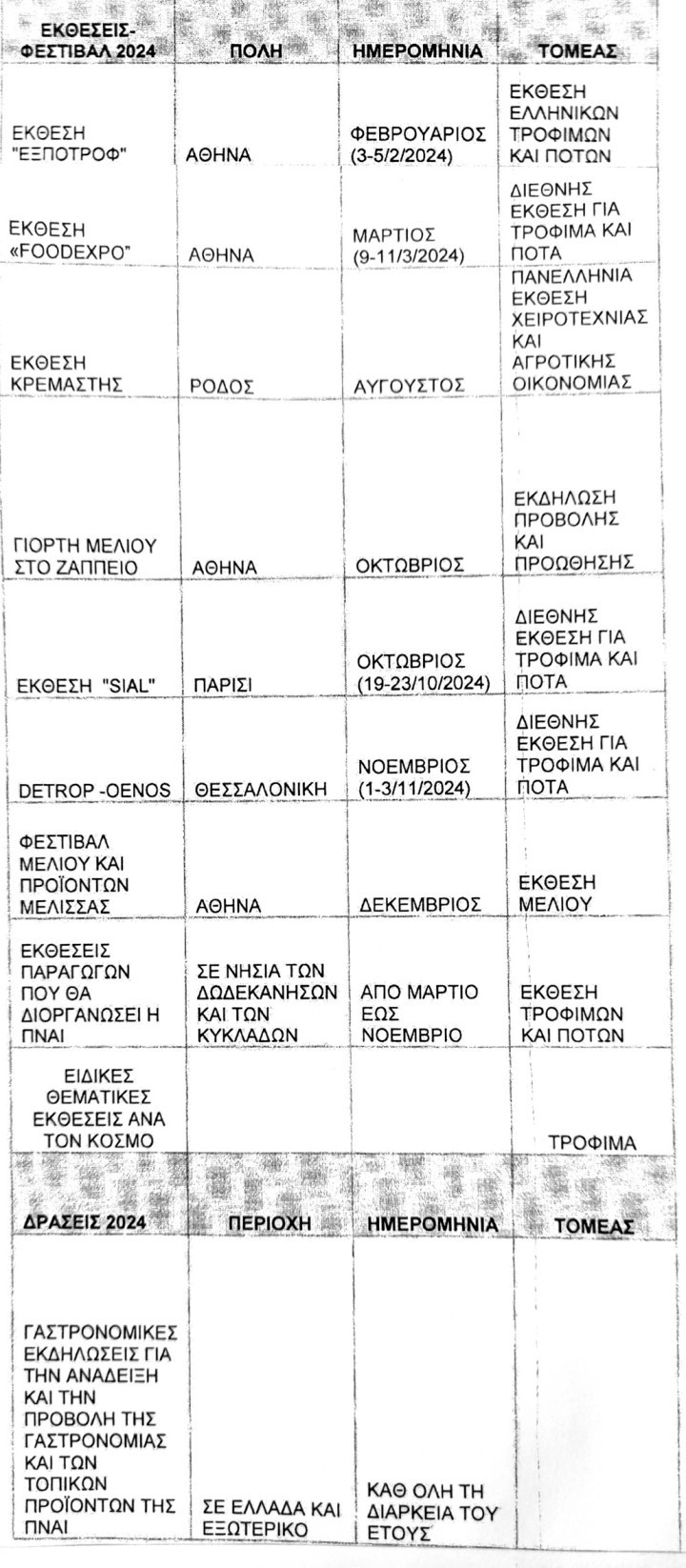 Διευκρινίζεται ότι οι Εκθέσεις και οι γαστρονομικές εκδηλώσεις που προτείνονται παρακάτω, καθώς και οι μήνες πραγματοποίησης τους είναι ενδεικτικό. Όσον αφορά τις θεματικές εκθέσεις, σημειώνεται ότι η ΠΝΑΙ θα συμμετέχει ανάλογα με την εκδήλωση ενδιαφέροντος των παραγωγών.