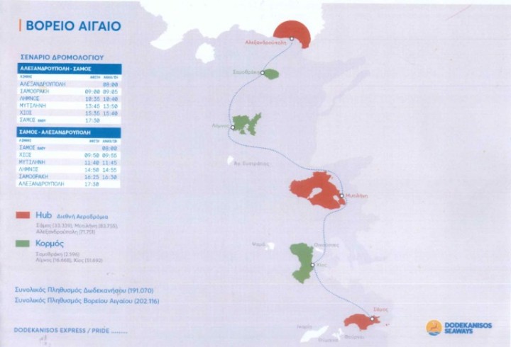 Ήδη, υπάρχει η σύνδεση της Σάμου και της Ικαρίας με λιμάνια της Δωδεκανήσου και της Ρόδου, όποτε μία τέτοια γραμμή θα συνδέσει τα νησιά του Βορειοανατολικού Αιγαίου με την Αλεξανδρούπολη και τη Ρόδο.