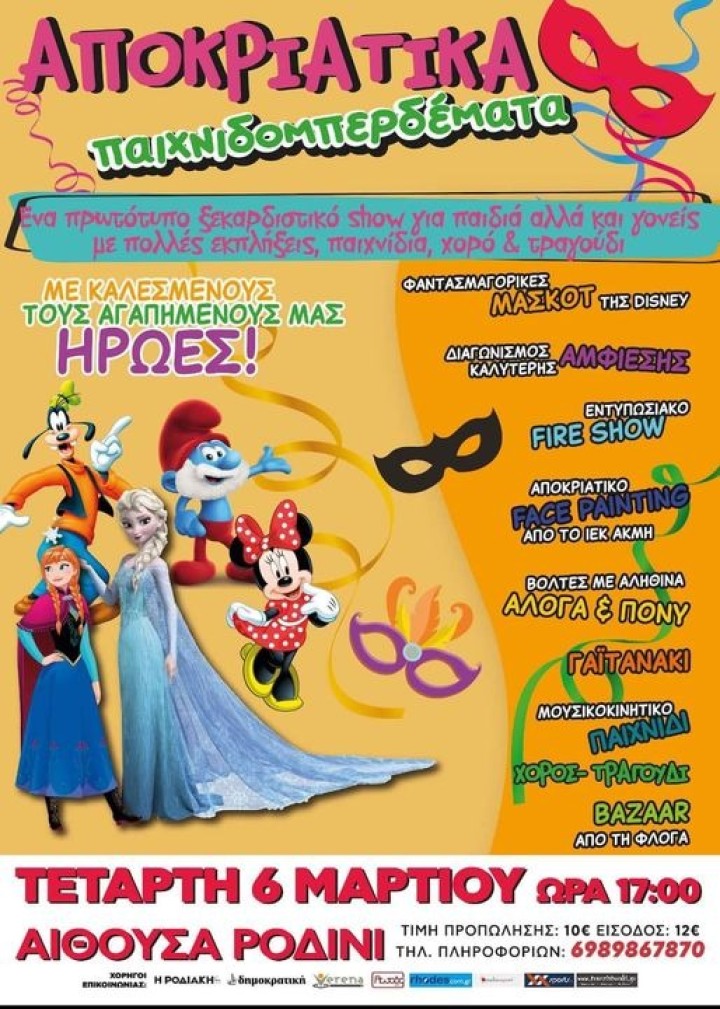Ένα μεγάλο αποκριάτικο ξέφρενο και χορταστικό event για παιδιά, αλλά και για τους γονείς έρχεται στη Ρόδο, αύριο Τετάρτη 6 Μαρτίου στις 17:00 το απόγευμα για μια μοναδική παράσταση στην αίθουσα στο Ροδίνι!!