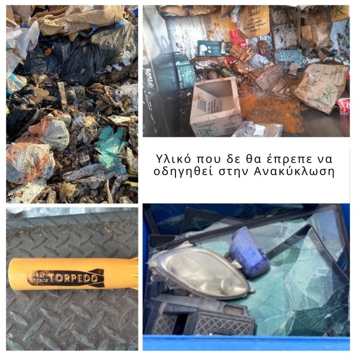 Οι φωτογραφίες είναι ενδεικτικές της κατάστασης που περιγράφουμε: σακούλες γεμάτες από μαγειρεμένα τρόφιμα, νωπά κρέατα, λαχανικά, λερωμένες συσκευασίες, κλαδέματα ακόμα και σπασμένα παρμπρίζ, βεγγαλικά ή άλλα επικίνδυνα απόβλητα, τα οποία σε καμία περίπτωση δεν μπορούν να ανακυκλωθούν και δεν πρέπει να βρίσκονται στους μπλε κάδους, έρχονται στο ΚΔΑΥ, με αποτέλεσμα να καταστρέφεται η ανακύκλωση.