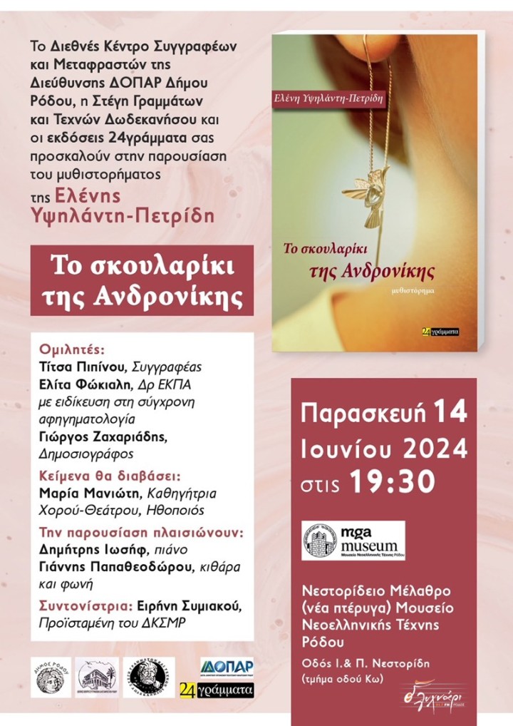 Το Διεθνές Κέντρο Συγγραφέων και Μεταφραστών της Διεύθυνσης ΔΟΠΑΡ του δήμου Ρόδου σε συνεργασία με τη Στέγη Γραμμάτων και Τεχνών Δωδεκανήσου και τις εκδόσεις “24 γράμματα” πραγματοποιούν την παρουσίαση του μυθιστορήματος της Ελένης Υψηλάντη-Πετρίδη, με τίτλο «Το σκουλαρίκι της Ανδρονίκης», την Παρασκευή 14 Ιουνίου 2024 και ώρα 19:30 στην αίθουσα της Νέας Πτέρυγας του Νεστοριδείου Μελάθρου (οδός Ι. & Π. Νεστορίδη - τμήμα οδού Κω).