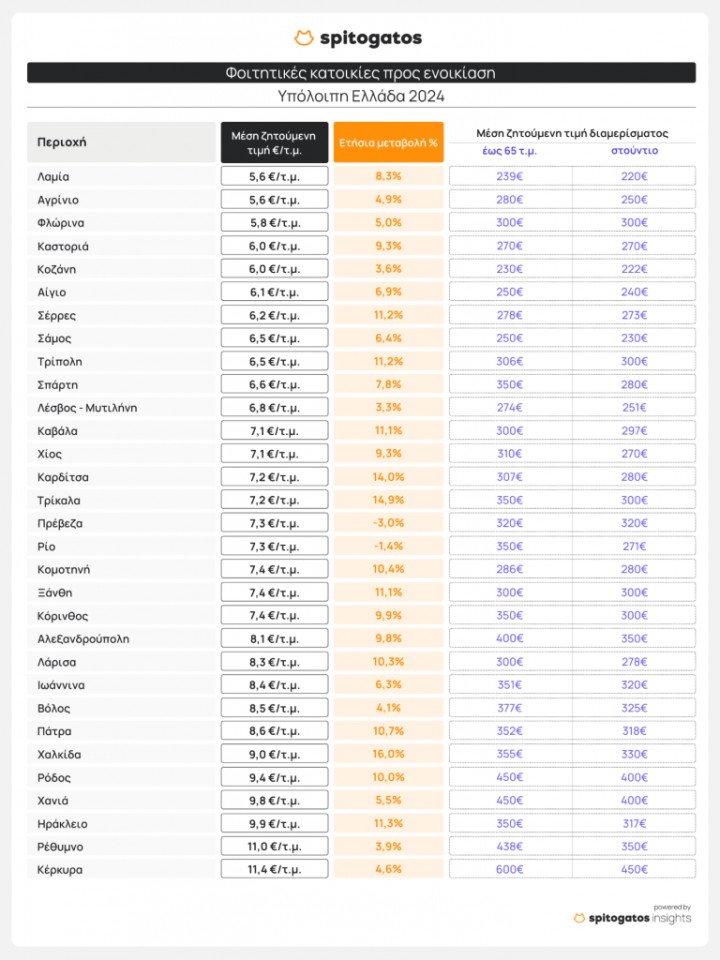 Φοιτητικό σπίτι αναζητούν πολλοί υποψήφιοι σε φοιτητουπόλεις στην υπόλοιπη Ελλάδα. Οι χαμηλότερες μέσες ζητούμενες τιμές φοιτητικών σπιτιών καταγράφηκαν στη Λαμία και στο Αγρίνιο, ενώ οι υψηλότερες καταγράφονται σε σημεία έντονου τουριστικού ενδιαφέροντος, όπως η Κέρκυρα και το Ρέθυμνο. Οι μεγαλύτερες αυξήσεις τιμών σημειώθηκαν στην Χαλκίδα και στα Τρίκαλα.