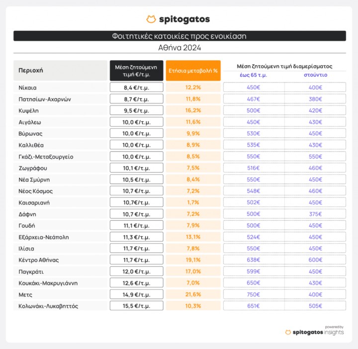 Στην Αθήνα, η χαμηλότερη μέση ζητούμενη τιμή ανά τετραγωνικό μέτρο φοιτητικού σπιτιού εντοπίζεται στην περιοχή της Νίκαιας, στην Πατησίων-Αχαρνών και στην Κυψέλη, ενώ η υψηλότερη τιμή παρατηρείται στην περιοχή Κολωνάκι–Λυκαβηττός και στην περιοχή Κουκάκι-Μακρυγιάννη. Ενδεικτικά, ένα διαμέρισμα κάτω από 65 τ.μ. στην περιοχή του Ζωγράφου, που αποτελεί μία από τις δημοφιλέστερες φοιτητικές συνοικίες λόγω εγγύτητας με την Πανεπιστημιούπολη και την Πολυτεχνειούπολη, στοιχίζει κατά μέσο όρο 516 ευρώ. Στα 400 ευρώ ανέρχεται η τιμή ενός στούντιο στην Νίκαια, που αποτελεί μία από τις οικονομικότερες περιοχές της Αττικής για αναζήτηση φοιτητικής κατοικίας.