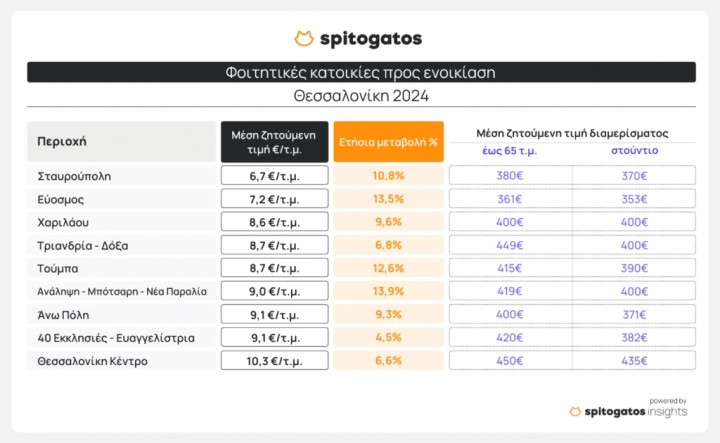 Οι περιοχές με τις υψηλότερες μέσες ζητούμενες τιμές ανά τετραγωνικό μέτρο είναι το κέντρο της Θεσσαλονίκης και οι 40 Εκκλησιές – Ευαγγελίστρια. Οι μεγαλύτερες αυξήσεις μέσης ζητούμενης τιμής ανά τετραγωνικό μέτρο φοιτητικού σπιτιού σημειώθηκαν στην περιοχή Ανάληψη-Μπότσαρη-Νέα Παραλία, καθώς και στην περιοχή του Ευόσμου, όπου καταγράφεται μία από τις χαμηλότερες μέσες ζητούμενες τιμές για ενοικίαση στούντιο (353 ευρώ).