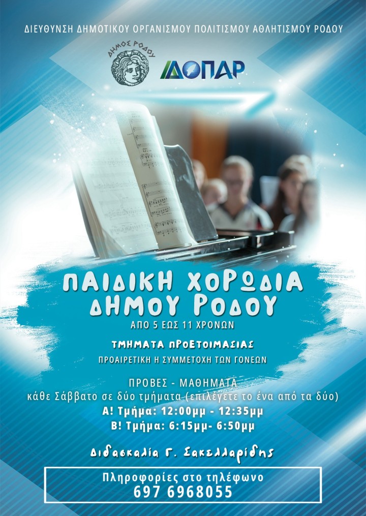 Από τη Διεύθυνση ΔΟΠΑΡ δήμου Ρόδου ανακοινώνεται ότι, «από το Σάββατο 14 Σεπτεμβρίου 2024, (και κάθε Σάββατο), ξεκινούν τη λειτουργία τους για φέτος τα εκπαιδευτικά τμήματα προετοιμασίας της Παιδικής Χορωδίας δήμου Ρόδου.