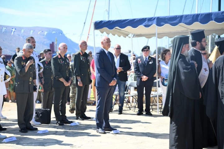 Η Ελληνική Πολιτεία δεν είναι σήμερα εδώ, όμως, μόνο για να αποτίσει τον δέοντα φόρο τιμής. Είναι και για να υποδηλώσει ότι οι Ένοπλές Δυνάμεις παραμένουν αρωγός στη κοινωνία της Λέρου και στους κατοίκους των Δωδεκανήσων και εν ειρήνη. Σε όλες τις δυσχερείς καταστάσεις που ίσως κληθούν να αντιμετωπίσουν. Είναι καθήκον των Ελληνικών Ενόπλων Δυνάμεων και μεγάλη τους προτεραιότητα να στηρίζουν τις κοινωνίες στις ακριτικές μας περιοχές.