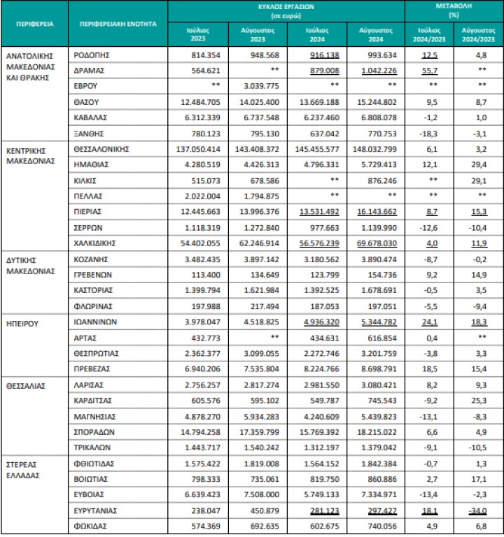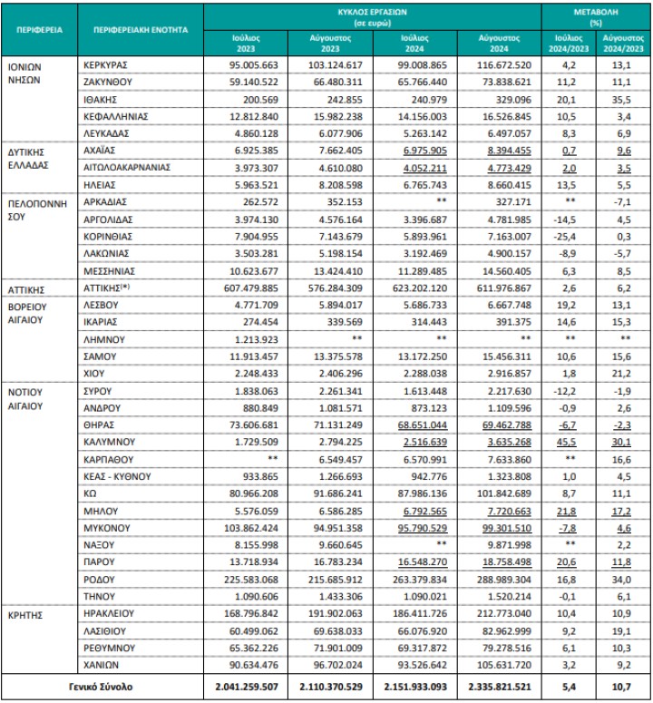 Η μεγαλύτερη αύξηση στον κύκλο εργασιών τον Αύγουστο 2024 σε σύγκριση με τον Αύγουστο 2023 παρατηρήθηκε στην Περιφερειακή Ενότητα Ρόδου με 34,0%