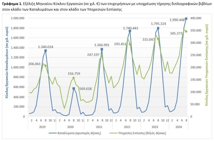 Για τις επιχειρήσεις στον κλάδο των Υπηρεσιών Εστίασης, με υποχρέωση τήρησης διπλογραφικών βιβλίων, ο κύκλος εργασιών ανήλθε σε 345.373.083 ευρώ, σημειώνοντας αύξηση 9,6% σε σχέση με τον Αύγουστο 2023, όπου είχε ανέλθει σε 315.047.023 ευρώ.