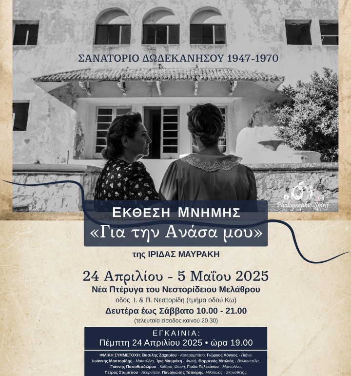 Στις 24 Απριλίου 2025 και ώρα 19.00, θα παρουσιαστεί η Έκθεση Μνήμης «Για την Ανάσα μου» της Ίριδας Μαυράκη, για το πρώην Σανατόριο Δωδεκανήσου (1947-1970) στη Νέα Πτέρυγα του Νεστοριδείου Μελάθρου (οδός Ι. & Π. Νεστορίδη-τμήμα οδού Κω).