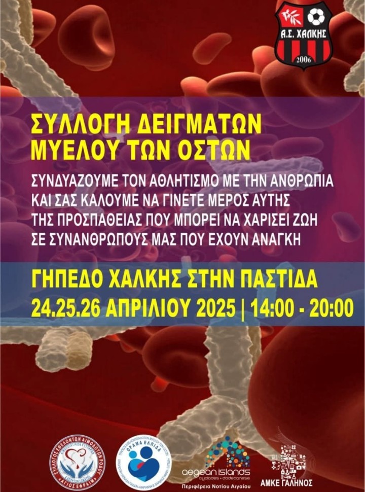 Ο ιδανικός συνδυασμός του αθλητισμού και του αλτρουισμού μέσα από την προσπάθεια της ποδοσφαιρικής ομάδας της Χάλκης, αφού από 24 έως 26 Απριλίου στο γήπεδό της που βρίσκεται στην Παστίδα, θα πραγματοποιείται συλλογή δειγμάτων μυελού των οστών.