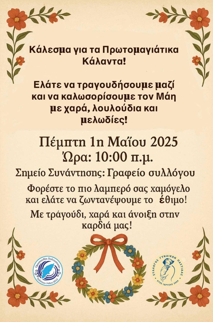 Τον Μάη πρόκειται να «υποδεχθούν» οι γυναίκες της Παστίδας, οι οποίες και απευθύνουν το θερμό τους κάλεσμα σε όσους διαθέτουν όρεξη και καλή διάθεση και επιθυμούν να καλωσορίσουν τον νέο μήνα, τραγουδώντας τα Πρωτομαγιάτικα κάλαντα.