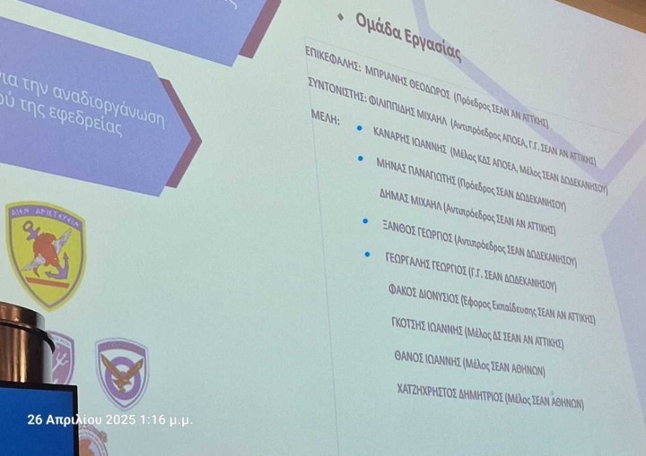 Με στόχο την μεταρρύθμιση και τον εκσυγχρονισμό του θεσμού της εφεδρείας ώστε να ενταχθεί ισότιμα στην «Ατζέντα 2030», έκλεισε τις εργασίες της η ημερίδα για την Αναδιοργάνωση της Εφεδρείας στο Αμφιθέατρο της Στρατιωτικής Σχολής Ευελπίδων την 26-04-2025, όπου παρευρέθησαν, ο Έφεδρος Ανθυπολοχαγός, Μητροπολίτης Περιστερίου κ.κ. Γρηγόριος, ο Έφεδρος Ανθυπολοχαγός Νικόλαος Δένδιας, Υπουργός Εθνικής Άμυνας, ο βουλευτής και πρόεδρος της Επιτροπής Εξοπλιστικών Προγραμμάτων και Συμβάσεων της Βουλής Άγγελος Συρίγος, ο Αρχηγός Γ.Ε.Ε.Θ.Α., Στρατηγός Δημήτριος Χούπης, ο Αρχηγός Γ.Ε.Σ., Αντιστράτηγος Γεώργιος Κωστίδης, ο Υπαρχηγός Γ.Ε.Ν., Υποναύαρχος Σπυρίδων Λαγάρας Π.Ν. ως εκπρόσωπος του Αρχηγού Γ.Ε.Ν. Αντιναυάρχου Δημήτριου – Ελευθέριου Κατάρα Π.Ν., ο Διευθυντής του Β’ Κλάδου του Γ.Ε.Α., Σελίδα 2 από 3 Υποπτέραρχος (Ι) Μάριος Μπαντουβάς ως εκπρόσωπος του Αρχηγού Γ.Ε.Α. Αντιπτέραρχου (Ι) Δημοσθένη Γρηγοριάδη, ο Διοικητής της Στρατιωτικής Σχολής Ευελπίδων, Υποστράτηγος Αναστάσιος Πολύχρονος και Αξιωματικοί των Ενόπλων Δυνάμεων καθώς και Έφεδροι Αξιωματικοί απ’ όλη την Ελλάδα, μέλη των Δ.Σ. των ΣΥΝΔΕΣΜΩΝ ΕΦΕΔΡΩΝ ΑΞΙΩΜΑΤΙΚΩΝ (Σ.Ε.Α.Ν.).