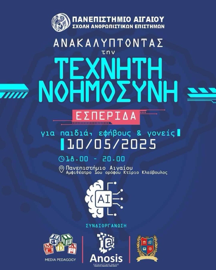 Εσπερίδα με θέμα: «Ανακαλύπτοντας την Τεχνητή Νοημοσύνη» Θα πραγματοποιηθεί στη Ρόδο το Σάββατο 10 Μαΐου 2025και ώρα 18:00-20:00 στοΠανεπιστήμιο Αιγαίου, (Αμφιθέατρο 1ου ορόφου – Κτίριο Κλεόβουλος).