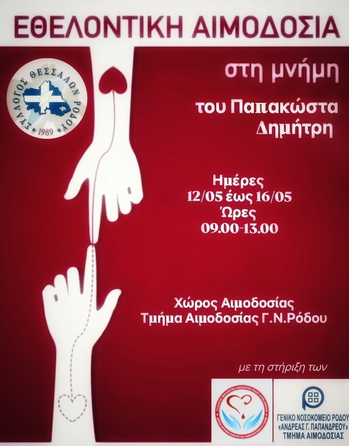 Ο Σύλλογος Θεσσαλών Ρόδου καλεί όλους τους πολίτες, τα μέλη και τους φίλους του, να συμμετάσχουν σε εθελοντική αιμοδοσία που θα πραγματοποιηθεί στη μνήμη του αείμνηστου Δημήτρη Παπακώστα, επί σειρά ετών ενεργού μέλους του συλλόγου.