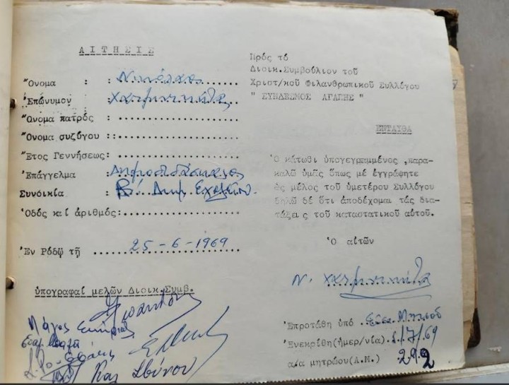 Ο Νικόλαος Χατζηνικήτας υπηρέτησε τον σύλλογο μας και τον τίμησε με την παρουσία του για 30 και πλέον χρόνια, ως γραμματέας την περίοδο 1971-1976, ως μέλος του Διοικητικού Συμβουλίου μέχρι το 1995 και ως μέλος της εξελεγκτικής επιτροπής αργότερα. Μάλιστα, στο αρχείο του συλλόγου υπάρχει η αίτηση εγγραφής του(σχετική φώτο), με ημερομηνία 25/6/1969 που εγκρίθηκε λίγο αργότερα στις 5/7/1969 με αριθμό μητρώου 292. Επίσης στο αρχείο πρακτικών του διοικητικού συμβουλίου μας το 1971 αναγράφετε η πρώτη του παρουσία ως γενικός γραμματέας στον «Σύνδεσμο Αγάπης» (σχετική φώτο).