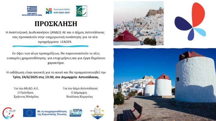 Η Αναπτυξιακή Δωδεκανήσου (ΑΝΔΩ) ΑΕ και ο δήμος Αστυπάλαιας προσκαλούν όλους όσοι ενδιαφέρονται στην ενημερωτική συνάντηση για τα νέα προγράμματα LEADER.