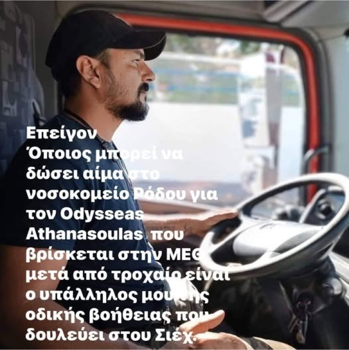 Σε ανάρτησή του ο Μουσταφά Σιέχ αναφέρει ότι ο ο Οδυσσέας Αθανασούλας, που νοσηλεύεται στην εντατική του Νοσοκομείου της Ρόδου, χρειάζεται αίμα, καλώντας έτσι τους συμπολίτες νας να βοηθήσουν.