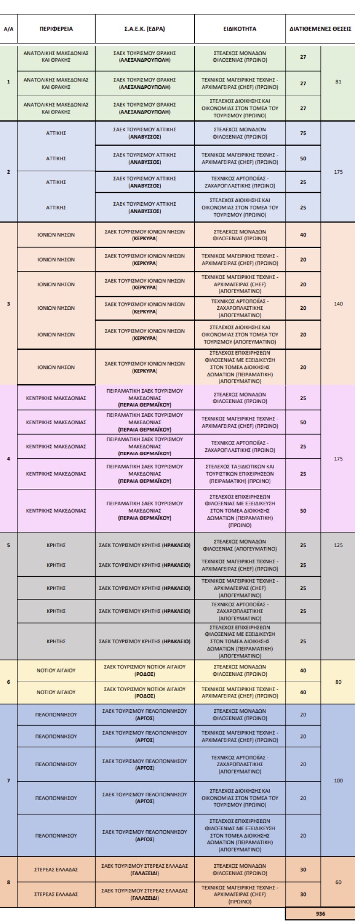 936 καταρτιζόμενοι θα εισαχθούν στις Σχολές Ανώτερης Επαγγελματικής Κατάρτισης (Σ.Α.Ε.Κ.) Τουρισμού του υπουργείου Τουρισμού σε όλη την Ελλάδα για το έτος κατάρτισης 2025-2026.