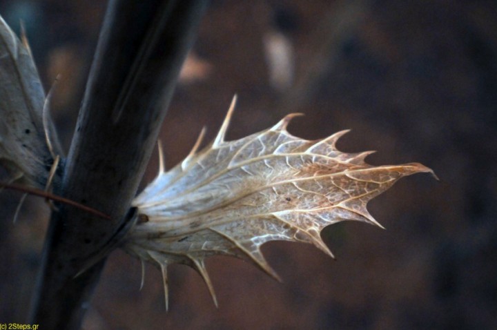Φύεται εν όρεσι και υλώδεσι τόποις, φύλλα έχουσα Χαμαιλέοντι εμφερή λευκώ, στενώτερα δε και λευκότερα, υποδασέα και ακανθώδη, καυλόν υπέρ δύο πήχεις, δακτύλου του μεγάλου ή και μείζον πάχος, υπόλευκον, κενόν. Επ΄ άκρου δε αυτού κεφαλή πρόσεστιν ακανθώδης, εχίνω θαλασσίω εμφερής, πλην ελάσσων και υπομήκης, άνθη προφυρά, εν οις το σπέρμα ως κνήκος, στρογγυλώτερον δε.