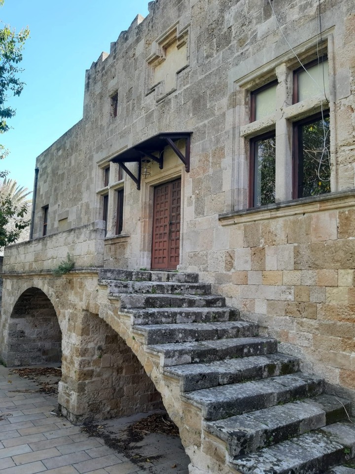 Το συγκρότημα απλωνόταν σε δύο τμήματα -πάνω από θολωτό δρομάκι κάθετο της ιστορικής οδού Ιπποτών- που επικοινωνούσαν λειτουργικά μεταξύ τους. Πλήγηκε σημαντικά από την πολιορκία του Μωάμεθ, το 1480 και από τον σεισμό του 1481, και ανακατασκευάστηκε στα 1514, όπως μαρτυρούσε η επιγραφή, που ήταν πλήρως ορατή μέχρι τις αρχές του περασμένου αιώνα, στο υπέρθυρο της αναγεννησιακής πόρτας εισόδου που οδηγεί στην αυλή του.
