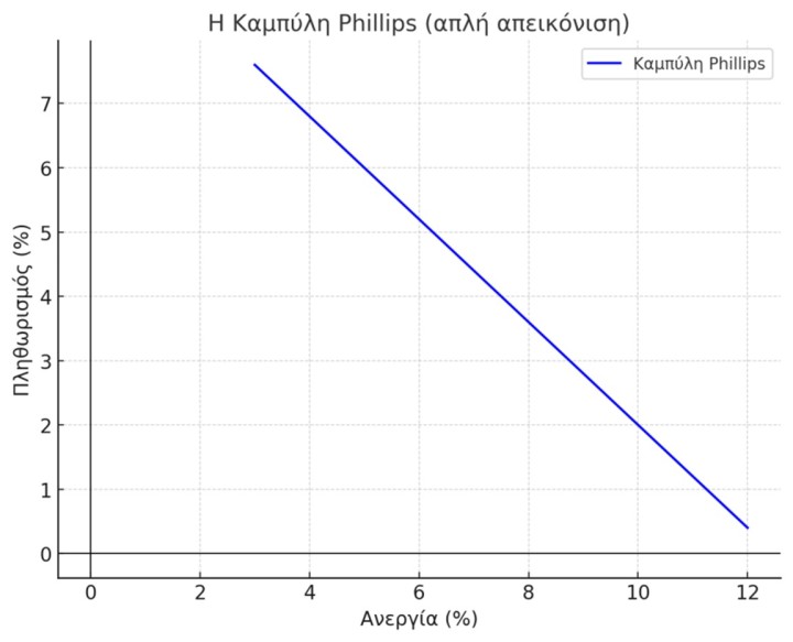 Παραθέτω μια απλή απεικόνιση της καμπύλης Phillips, όπου δείχνει την αντίστροφη σχέση μεταξύ ανεργίας (οριζόντιος άξονας) και πληθωρισμού (κατακόρυφος άξονας):