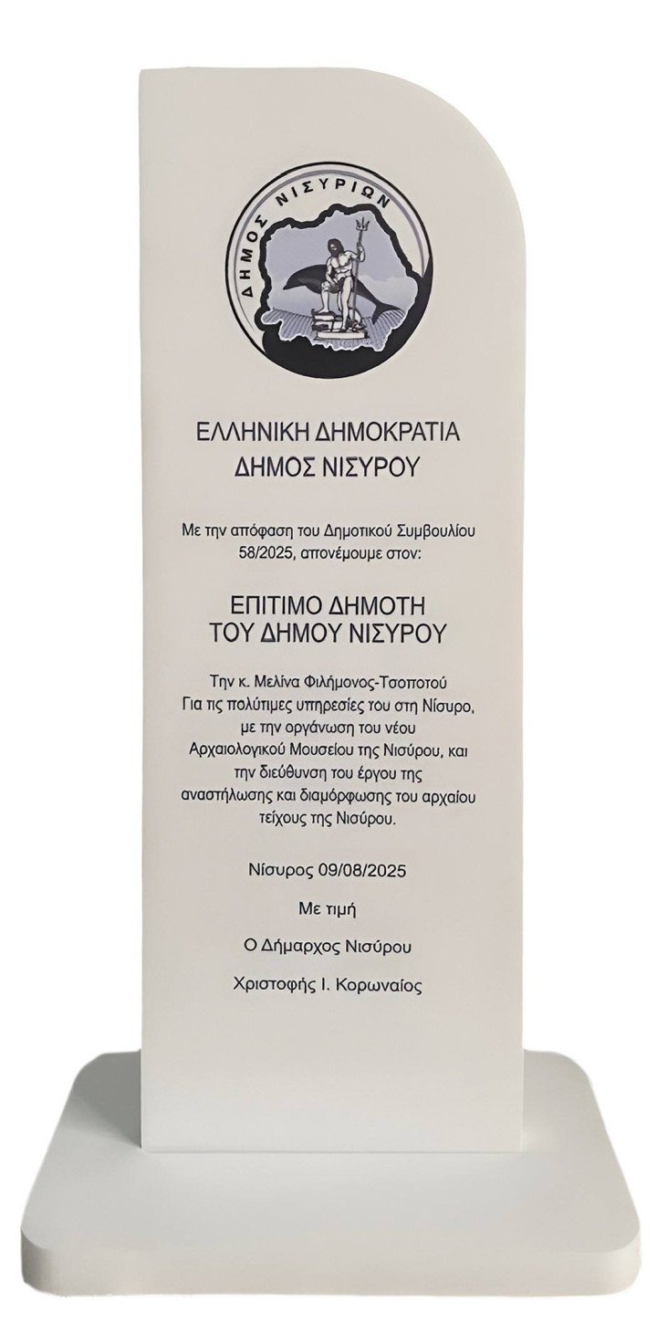 Μια ξεχωριστή τιμή αποδόθηκε στις 9 Αυγούστου 2025 από τον δήμο Νισύρου στην επίτιμη έφορο Αρχαιοτήτων δρ. Μελίνα Φιλήμονος- Τσοποτού και κατ’ επέκταση, στην Εφορεία Αρχαιοτήτων Δωδεκανήσου.