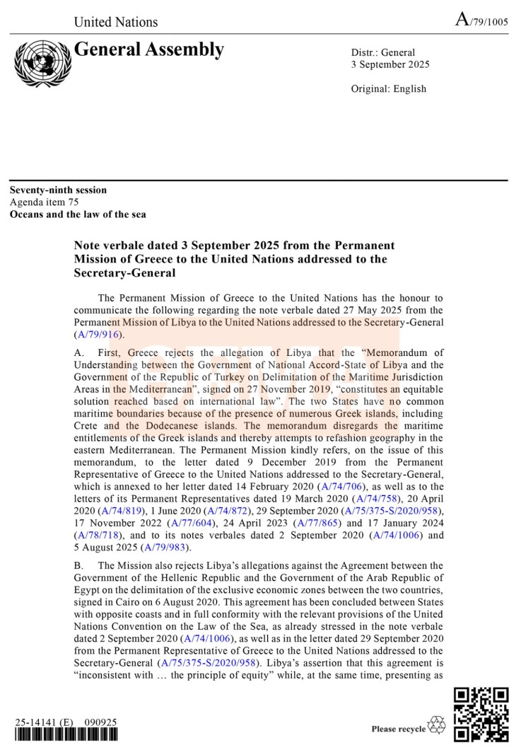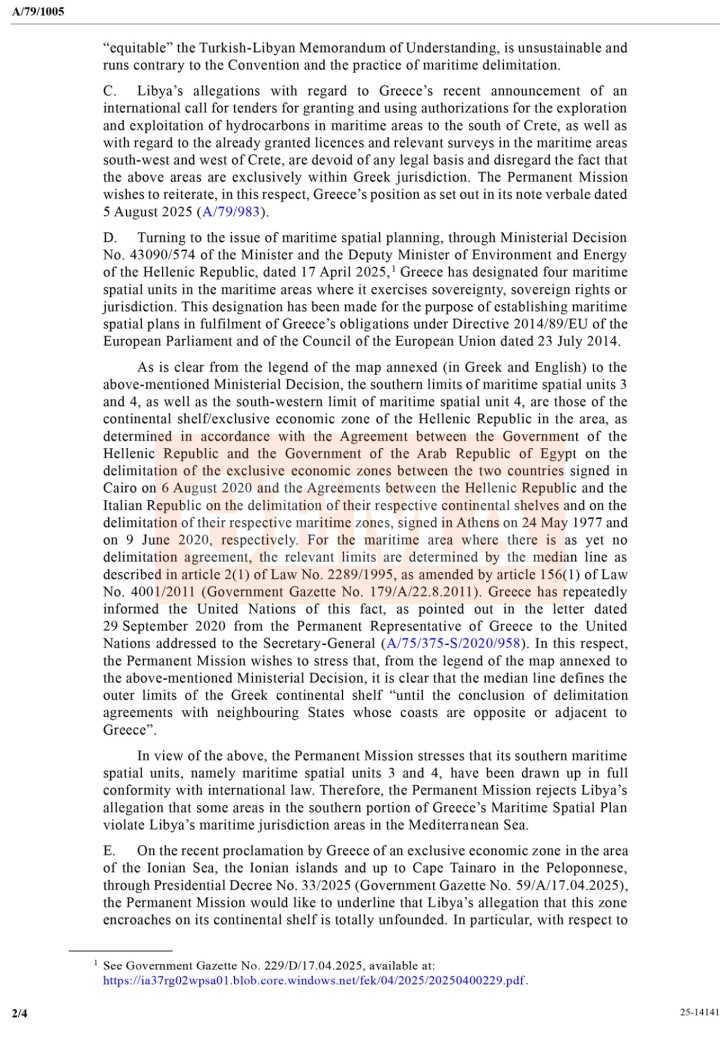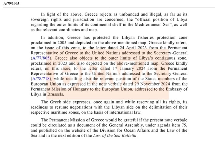Η ελληνική επιστολή:Η Μόνιμη Αντιπροσωπεία της Ελλάδας στον Οργανισμό Ηνωμένων Εθνών έχει την τιμή να γνωστοποιήσει τα ακόλουθα σχετικά με τη ρηματική διακοίνωση της 27ης Μαΐου 2025 της Μόνιμης Αντιπροσωπείας της Λιβύης στον Οργανισμό Ηνωμένων Εθνών, απευθυνόμενη προς τον Γενικό Γραμματέα (A/79/916).
