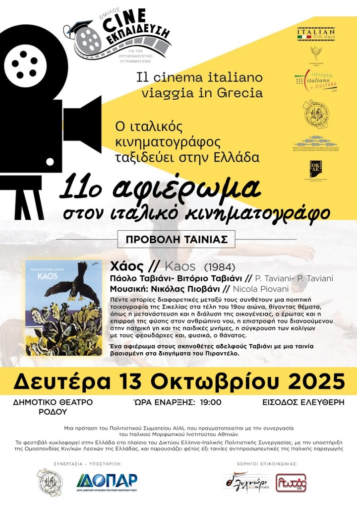 Η φετινή διοργάνωση στη Ρόδο ξεκινά με την προβολή της σπονδυλωτής ταινίας «Χάος» (Kaos, 1984), σε σκηνοθεσία Πάολο και Βιτόριο Ταβιάνι, βασισμένη σε διηγήματα του Λουίτζι Πιραντέλλο και με μουσική του Νικόλα Πιοβάνι.