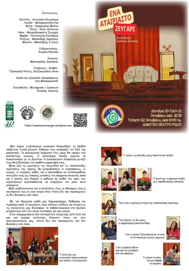 Θεατρική παράσταση από το Λύκειο Ιαλυσού: «Ένα Αταίριαστο Ζευγάρι»
