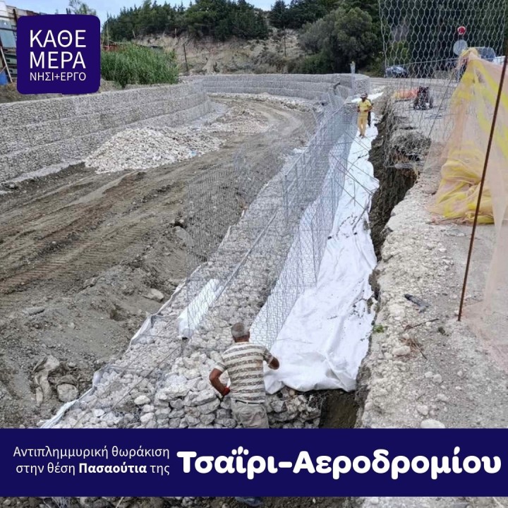 «Καλημέρα. Στη θέση Πασαούτια της επαρχιακής οδού Τσαΐρι-Αεροδρομίου στην Ρόδο, αντιμετωπίσαμε την πιο επικίνδυνη βλάβη που μας άφησε η θεομηνία “Bora”. Πιο επικίνδυνη, γιατί εξ αυτής κινδύνευσε η Ρόδος να μείνει χωρίς έναν κεντρικό οδικό άξονα της μέσα στην τουριστική περίοδο του '25. Τον αντιμετωπίσαμε αυτόν τον κίνδυνο άμεσα και χωρίς η λεωφόρος Τσαΐρι-Αεροδρομίου να κλείσει ούτε ώρα. Σήμερα, τα έργα στην θέση Πασαούτια αυτής της οδού έχουν προχωρήσει πολύ και όπως σε όλα τα μέτωπα που ταυτόχρονα δουλεύουμε, η πρόοδος μάς δίνει δύναμη. Δύναμη για τη συνέχεια στα αντιπλημμυρικά έργα, στο νησί που ιστορικά δοκιμάζεται περισσότερο από οποιοδήποτε άλλο από πλημμυρικά φαινόμενα και στο οποίο το τελευταίο μόνο διάστημα είτε έχουν ήδη ολοκληρωθεί, είτε βρίσκονται σε εξέλιξη τα περισσότερα και μεγαλύτερα αντιπλημμυρικά έργα στην ιστορία του. Συνεχίζουμε, μόνο με σκληρή δουλειά.»